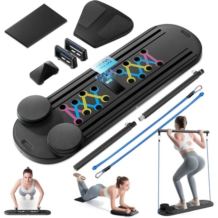 Manerele din spuma aderenta, benzile de rezistenta robuste cu carabine metalice si constructia stabila, cu o limita de greutate de pana la 200 kg, asigura un antrenament sigur si confortabil. Pe langa placa, setul include o pernuta moale pentru genunchi (extrem de confortabila), un suport suplimentar pentru maini, doua manere pentru flotari, benzi de rezistenta si o bara din doua piese – practic tot ce ai nevoie pentru un antrenament complet al intregului corp.