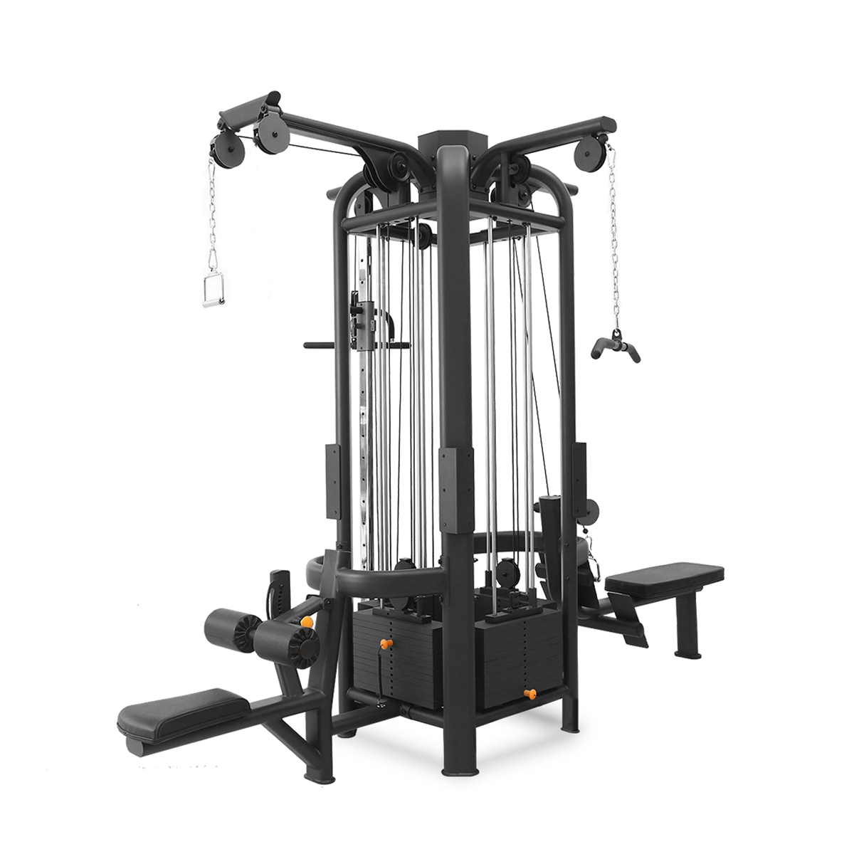 Aparat multifunctional cu 4 statii SPORTMANN F1-7088, face parte din seria de echipamente profesionale, ce ofera utilizatorilor o experienta de antrenament premium la o valoare excelenta. Cadrul robust din metal ii confera o stabilitate mare in timpul antrenamentelor intense si ii permit o limita de greutate pentru utilizator de 200 kg. Datorita celor 4 statii cu greutati 4 persoane se pot antrena simultan la un singur aparat lucru care benefic pentru o sala de sport pentru ca inlocuieste 4 aparate individuale si ocupa un spatiu mai mic. Acesta ofera un confort sporit in timpul antrenamentului, datorita tapiteriei din spuma de densitate mare si a captuseli din piele ecologica care ofera o rezistanta la uzura. Posibilitate de reglare suportului pentru picioare ofera un confort mai mare in timpul exercitiului. Acest aparat mai are si un scripete care se poate regla in inaltime si se poate roti 180 de grade.