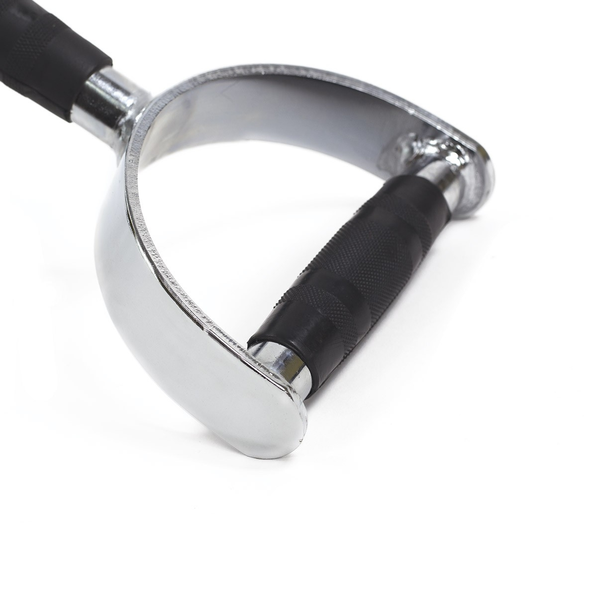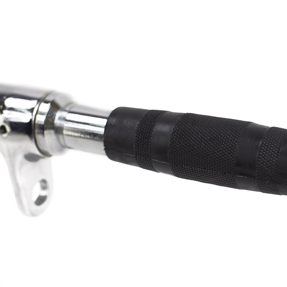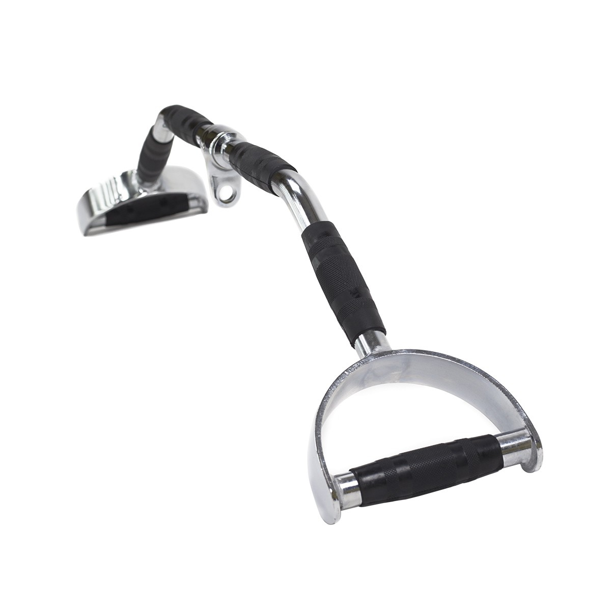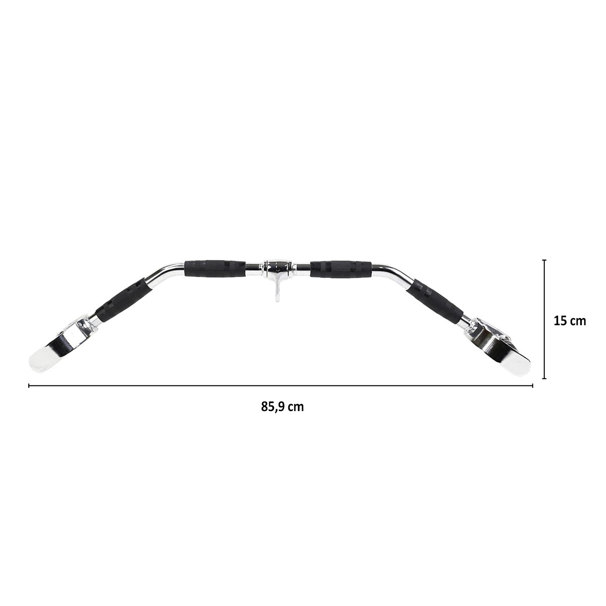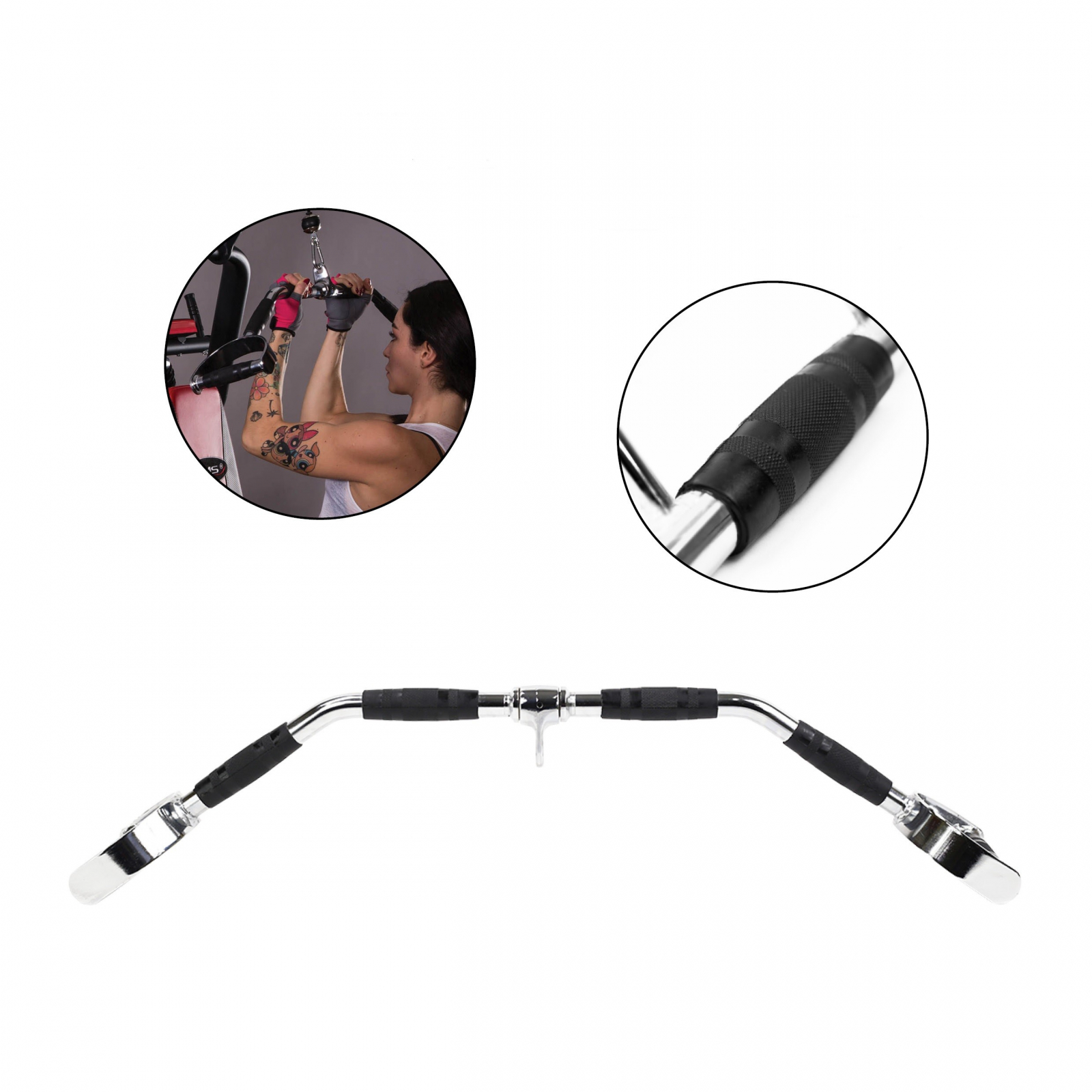 Manerul este fabricat din otel de calitate superioara pentru a permite antrenamentul cu sarcina mare. Lungimea sa si spatierea manerelor acoperite cu cauciuc ofera multe optiuni de prindere de la o prindere foarte ingusta la una foarte larga. In consecinta, in timpul fiecarui exercitiu, priza permite dezvoltarea muschilor. La cele mai largi sectiuni, prinderile de mana sunt asezate in unghi, ceea ce inseamna ca atunci cand trageti bara pe scripetele de sus coatele sunt tinute aproape de corp pentru o tehnica de exercitii mai buna. In timpul antrenamentului, prinderea permite angajarea in exercitiu a muschilor greu de lucrat cu o priza dreapta. Acest lucru este posibil datorita manerelor setate pentru a oferi o prindere neutra. In plus, acestea sunt acoperite cu cauciuc pentru a permite o prindere sigura si confortabila, fara a fi nevoie sa va faceti griji ca echipamentul ar putea sa va alunece din maini.