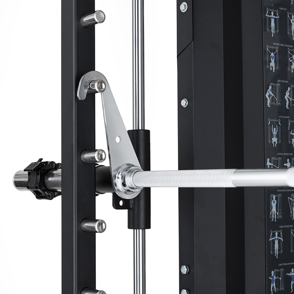 Tije ghid cu contragreutate si rulmenti de clasa superioara permit o miscare lina si un antrenament in conditii de siguranta. Datorita unui sistem de blocare de siguranta, nu vei avea nevoie de un partener de antrenament. Poti, de asemenea, sa utilizezi spatiul liber din mijloc, aducandu-ti banca de antrenament si facand presa la banca si alte exercitii bazate pe acest tip de exercitii.