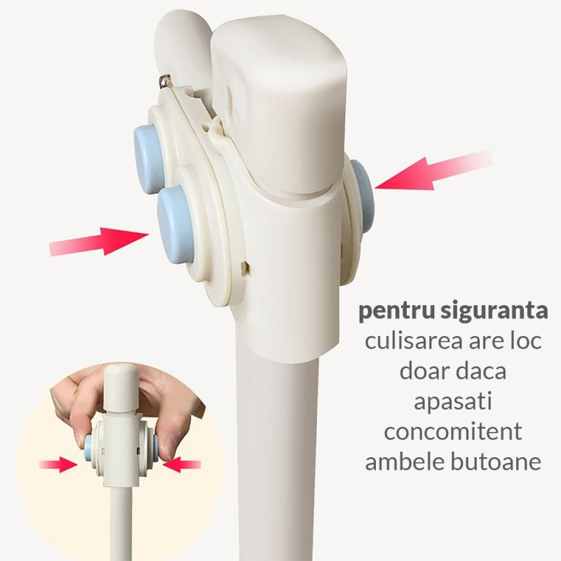 Sistemul de culisare este facil dar in acelasi timp securizat - presupune apasarea concomitenta a doua butone aflate pe parti opuse - facil chiar si cu o singura mana pentru adult, dar dificl pentru mainile micute ale copilasului