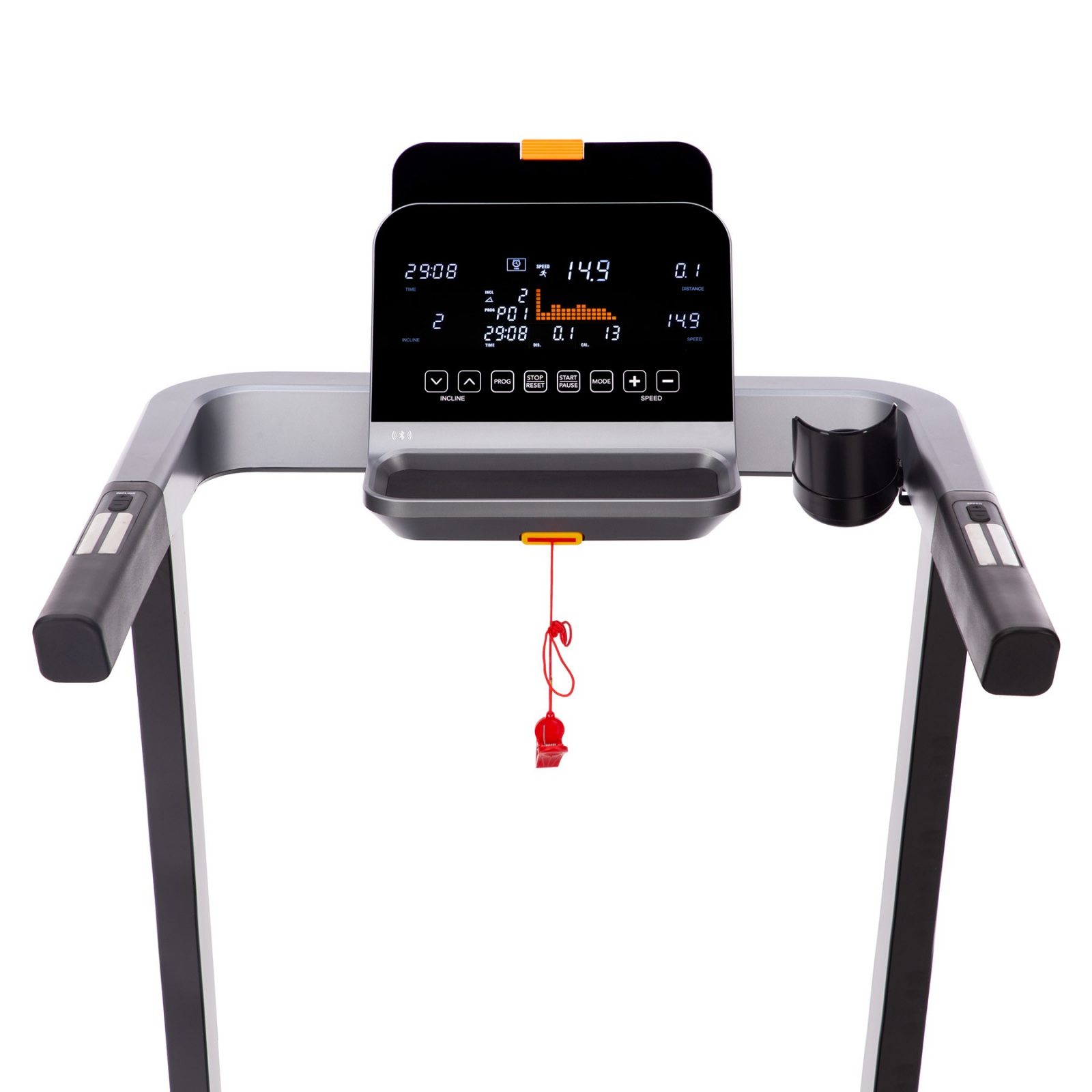 Banda de alergare ofera o suprafata de alergare spatioasa de 130 x 45 cm si un sistem avansat de amortizare care consta din 6 perne interne si 6 exterioare. Prin urmare, echipamentul reduce eficient sarcina asupra articulatiilor, asigurand confort chiar si in timpul antrenamentelor intense. Designul pliabil va permite sa depozitati banda de alergare in mod convenabil dupa antrenament, iar rotile de transport usureaza mutarea acesteia.