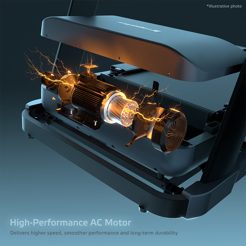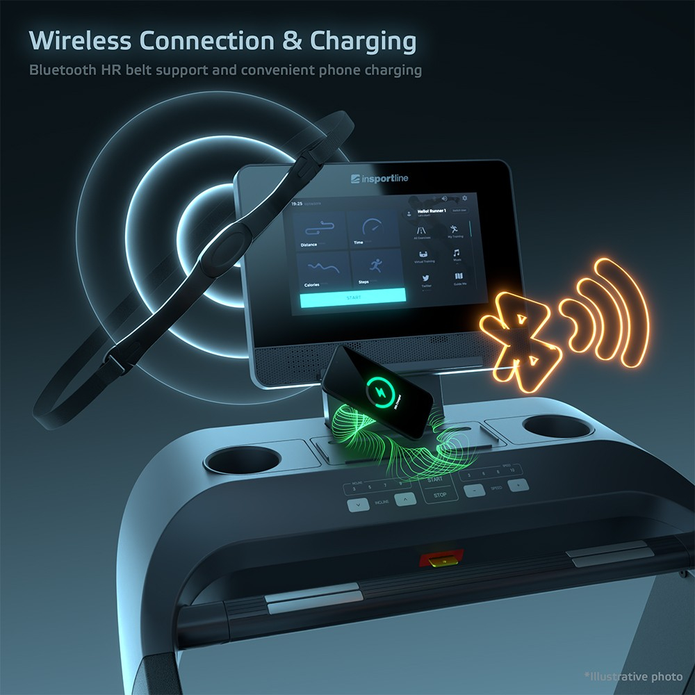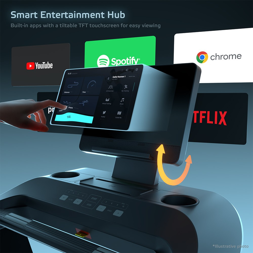 Vei fi atras imediat de ecranul tactil TFT de 15,6”, care nu doar afiseaza clar toate datele despre antrenament, ci ofera si divertisment in timpul alergarii. Aplicatiile preinstalate precum YouTube, Netflix, Spotify, Facebook, Chrome si Prime Video transforma fiecare minut petrecut pe banda intr-o experienta placuta. Desigur, banda dispune de conectivitate Bluetooth pentru casti, incarcare wireless si USB pentru telefon, precum si de butoane Touch & Run pe manere pentru ajustarea rapida a vitezei si a inclinatiei.