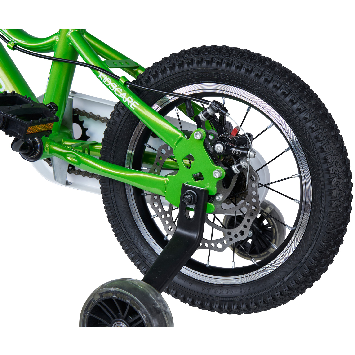 Descopera bicicleta pentru copii HappyCycles KidsCare, cu roti de 12 inch, roti ajutatoare si frane pe disc, intr-o nuanta de verde vibrant.