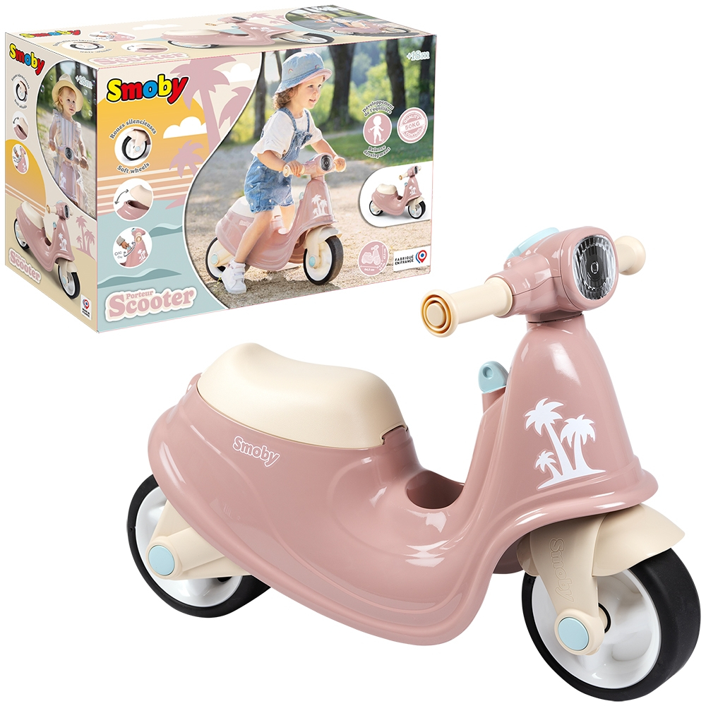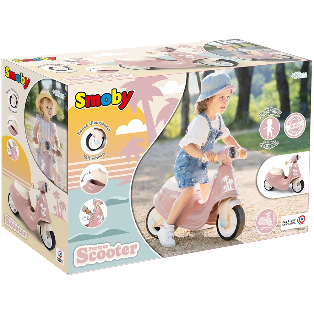 Scuter Smoby Scooter Ride-On fara pedale pentru copii cu varsta incepand de la 1,5 ani. Rotile late din material moale asigura o buna aderenta pe sol. Sub sezut este pozitionat un compartiment de depozitare pentru jucariile celui mic.