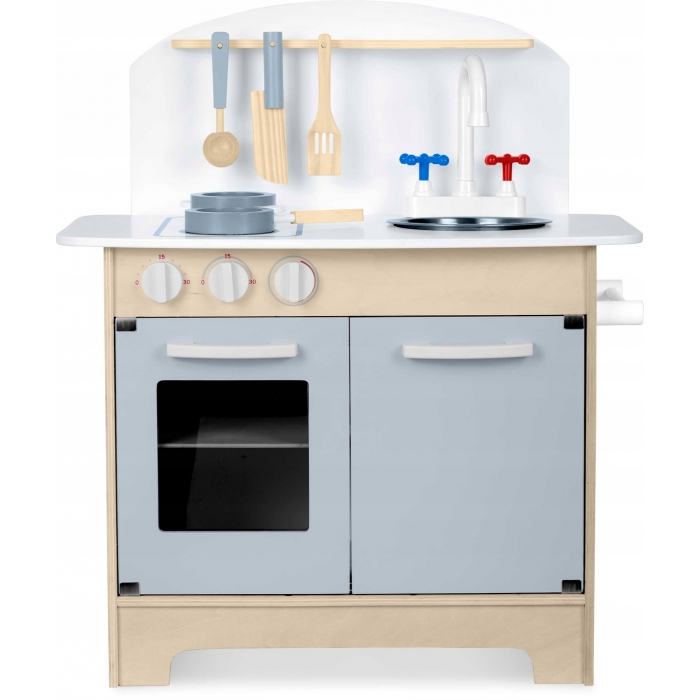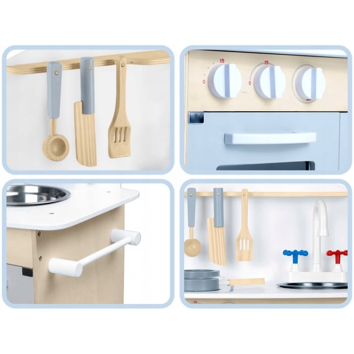 In partea dreapta a blatului se afla o chiuveta si un robinet, datorita carora micul tau bucatar va putea spala vasele dupa ce a terminat de gatit. In partea stanga a blatului de lucru este prevazuta o plita cu doua arzatoare.