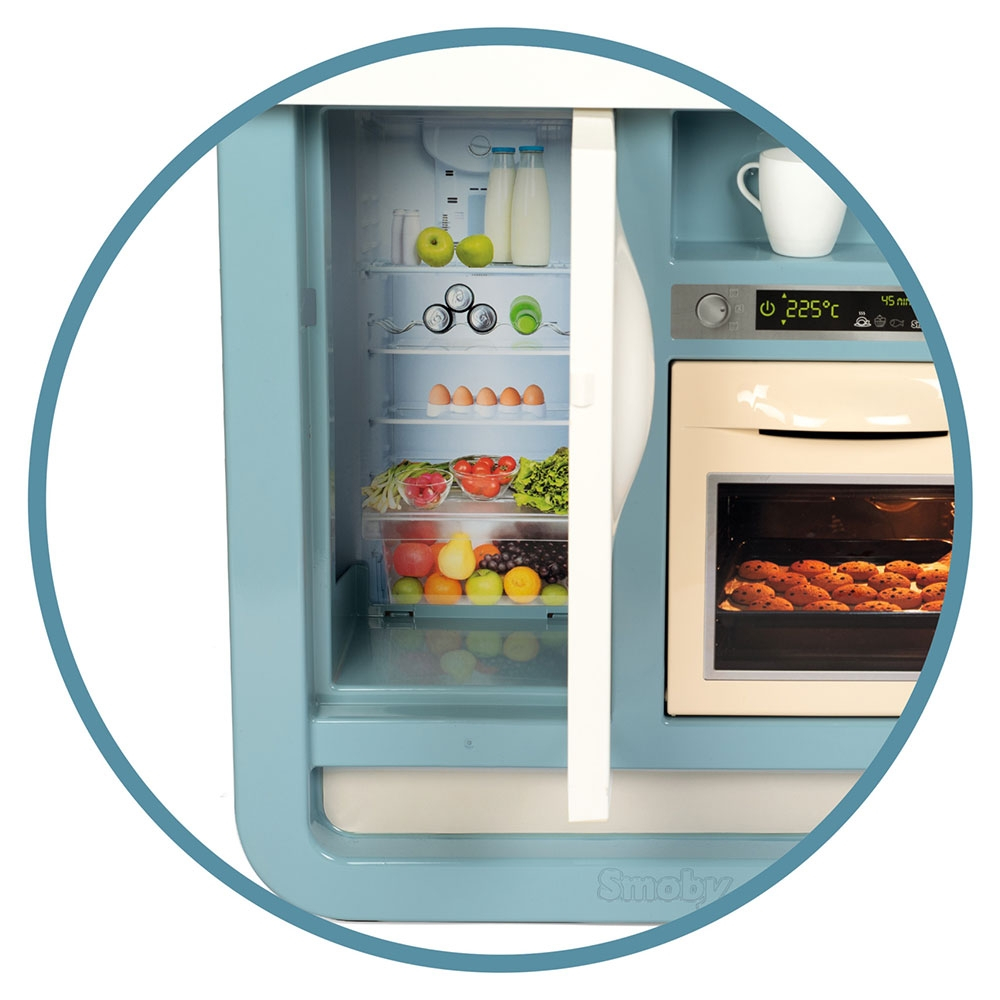 - Bucataria Smoby este dotata cu 23 de accesorii interesante. Printre aceste accesorii se regasesc: frigider la care se deschide usa, cuptor la care se deschide usa, plita (cu sunet specific "Blop-Blop"), chiuveta, expresor de cafea cu pastile, oala, tigaie, si alte accesorii