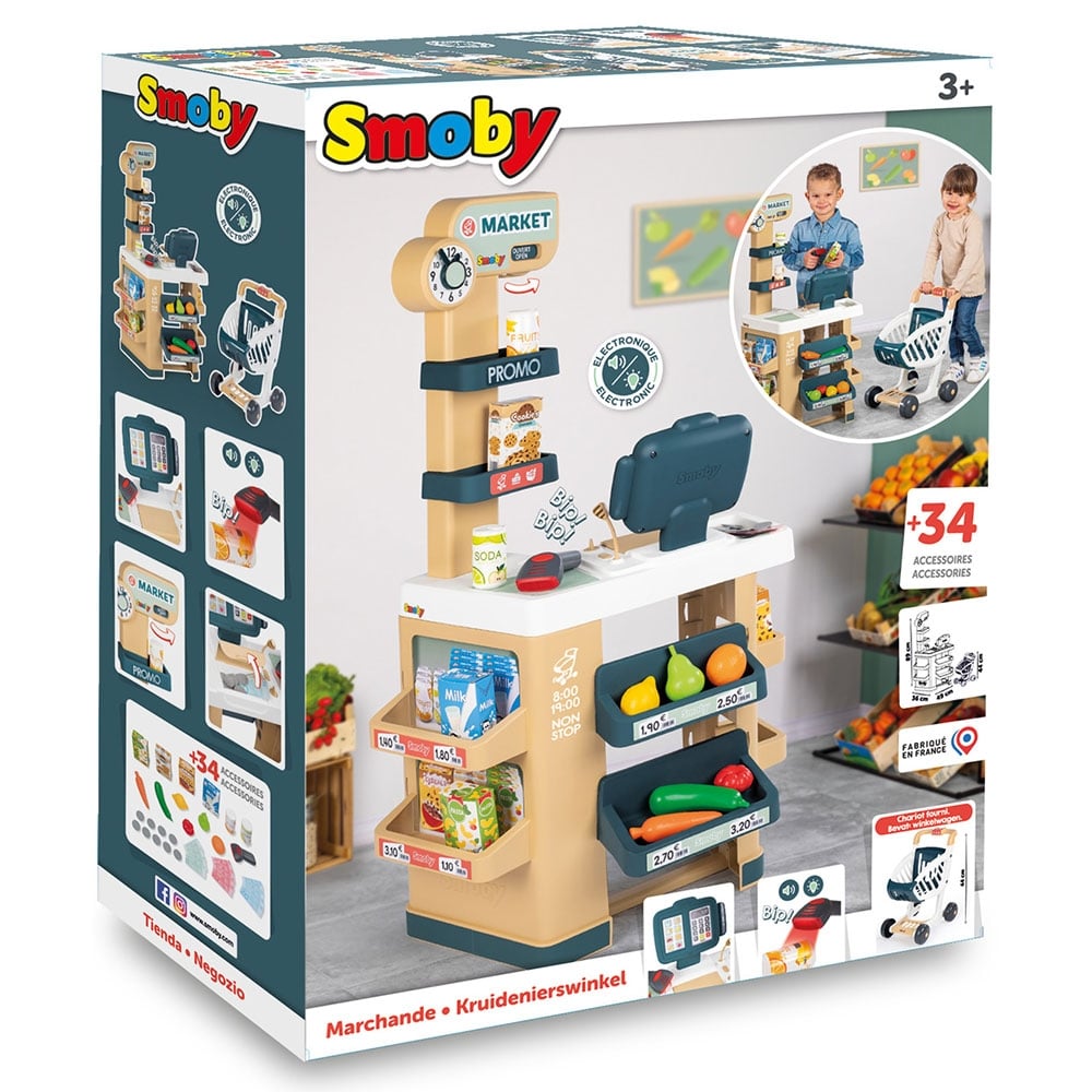 Supermarketul pentru copii Smoby cu 34 de accesorii este o jucarie interactiva si moderna fabricata de producatorul francez Smoby fiind potrivita incepand cu varsta de 3 ani atat pentru fetite cat si pentru baietei