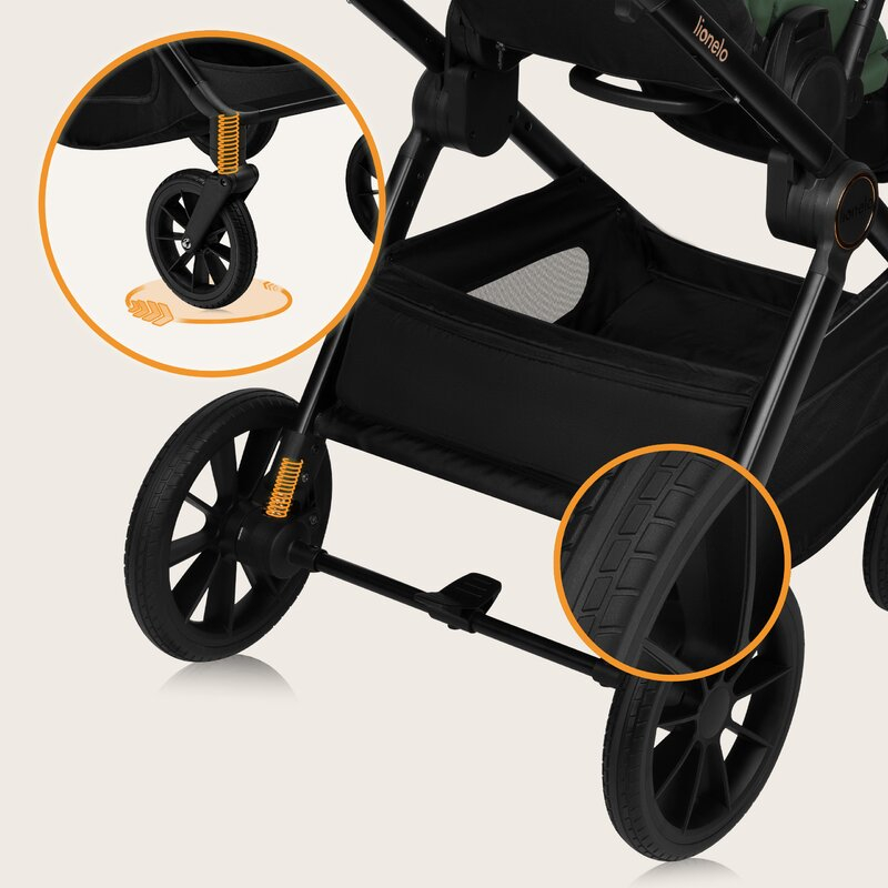 Rotile mari, din cauciuc, pentru toate tipurile de teren (29 cm si 20 cm in diametru) au un profil adanc si suspensie avansata pentru a asigura o plimbare lina si confortabila chiar si pe terenuri dificile si inegale. Rotile frontale pivotante la 360 grade garanteaza manevrabilitate adecvata, care poate fi imbunatatita prin ajustarea pozitiei landoului.