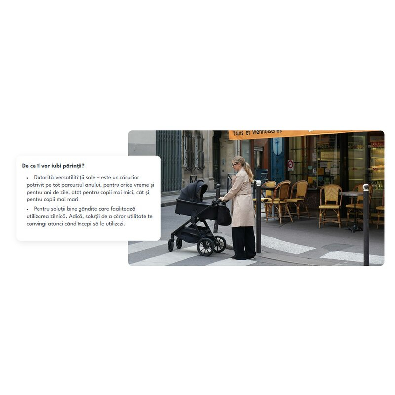 Caruciorul are un design elegant, fara a compromite practicitatea. Caracteristicile functionale includ carlige pentru geanta pe manerul caruciorului, un organizator cu fermoar la cos, un suport pentru pahar si un fermoar dublu pe husa landoului. Culorile atent coordonate si brandul discret creeaza o impresie generala de eleganta rafinata.