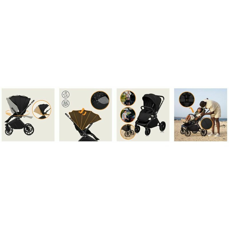 Materialele folosite sunt de cea mai inalta calitate datorita continutului ridicat de elastan, husa nu se sifoneaza, iar tesatura de calitate superioara este rezistenta la uzura si conditii meteo. Centurile sunt echipate cu o catarama magnetica speciala pentru o fixare usoara, iar adaptoarele incluse permit ajustarea inaltimii landoului in functie de cerintele parintilor.