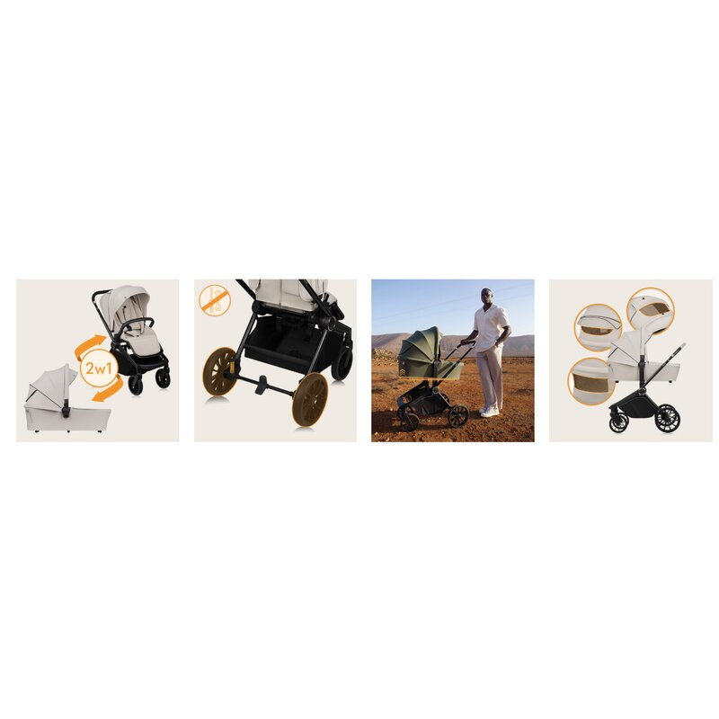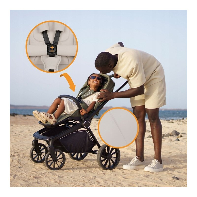 Materialele folosite sunt de cea mai inalta calitate datorita continutului ridicat de elastan, husa nu se sifoneaza, iar tesatura de calitate superioara este rezistenta la uzura si conditii meteo. Centurile sunt echipate cu o catarama magnetica speciala pentru o fixare usoara, iar adaptoarele incluse permit ajustarea inaltimii landoului in functie de cerintele parintilor.