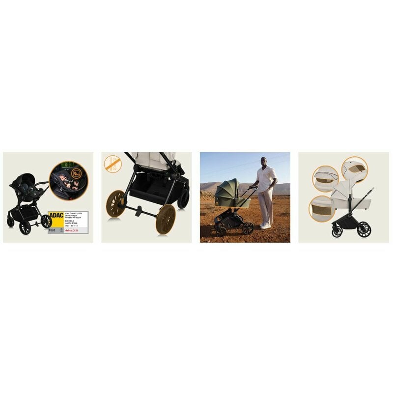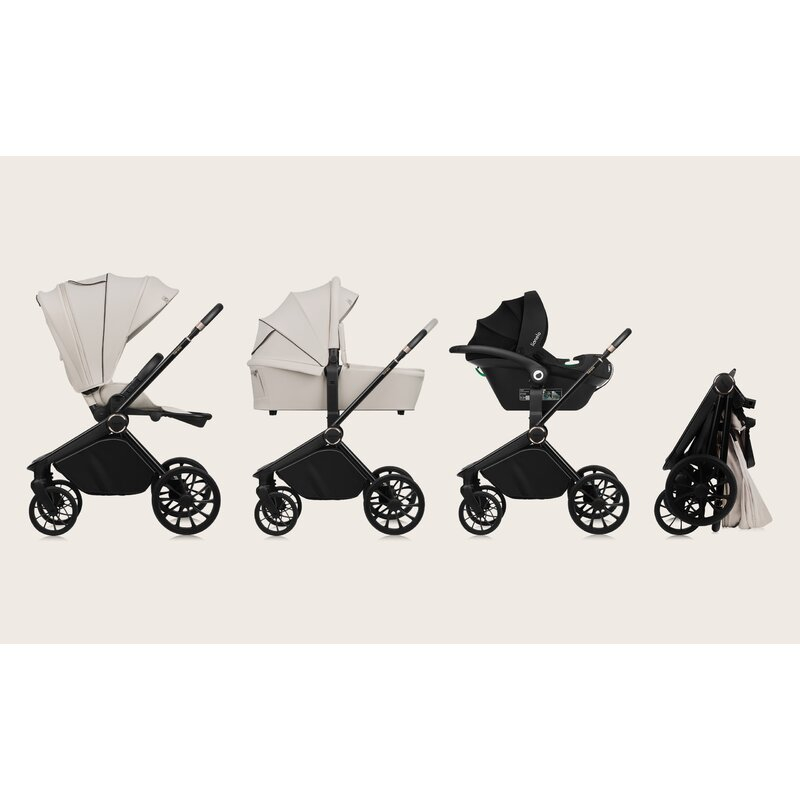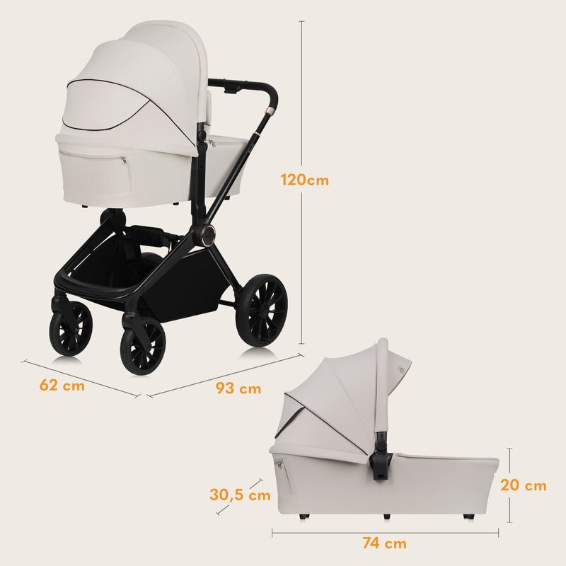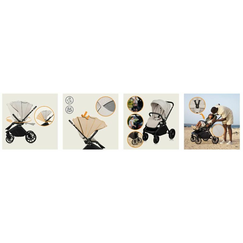 Husa caruciorului, fabricata cu un continut ridicat de elastan, ramane neteda si fara cute, in timp ce tesatura premium asigura durabilitate indelungata chiar si in conditii meteo dure. Hamul are o catarama magnetica pentru o fixare rapida si usoara, iar adaptoarele incluse permit ajustarea inaltimii landoului pentru a se potrivi nevoilor parintilor.