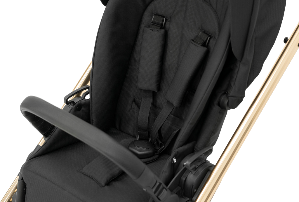 Căruciorul sport este echipat cu centuri de siguranță în 5 puncte pe care copilul nu le poate desface singur și bară de siguranță. Aceste elemente asigură copilul la locul lui și îl protejează de cădere, astfel încât nu trebuie să te îngrijorezi de o călătorie sigură.