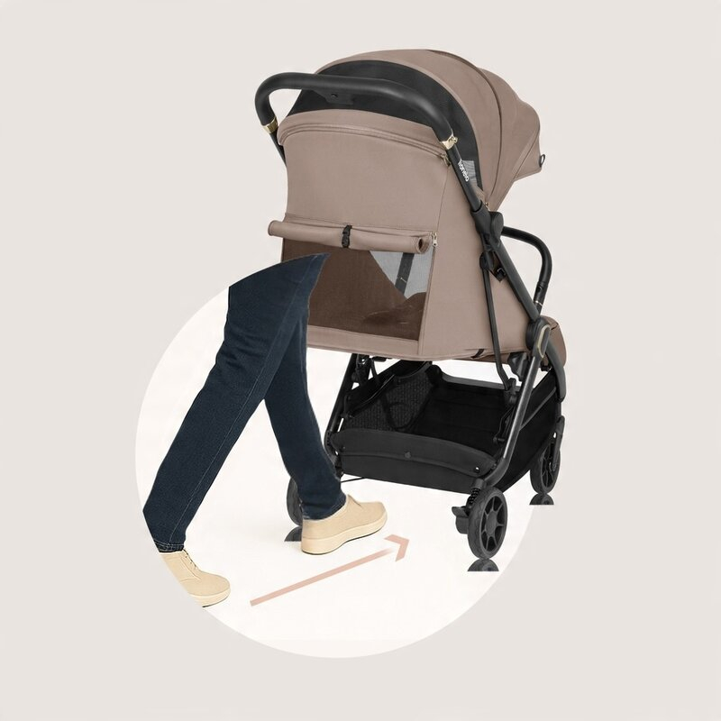 Bess se pliaza automat printr-o simpla miscare – apasa butonul si se strange singur. Dupa pliere, ramane stabil in pozitie verticala si tapiteria nu atinge solul. Include si o curea de umar pentru transport facil.