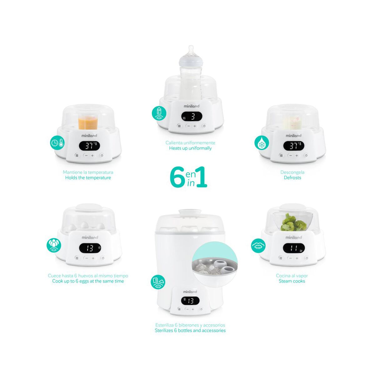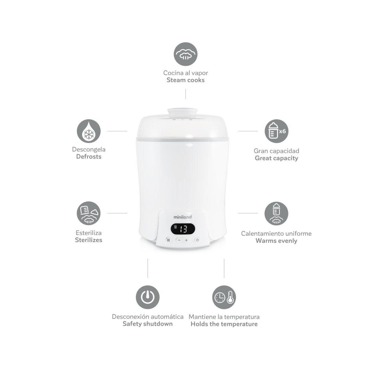 Sterilizeaza pana la 6 biberoane , tetinele aferente, in acelasi timp. Pentru eficienta sporita, include separator pentru biberoane si capac inchis ermetic.