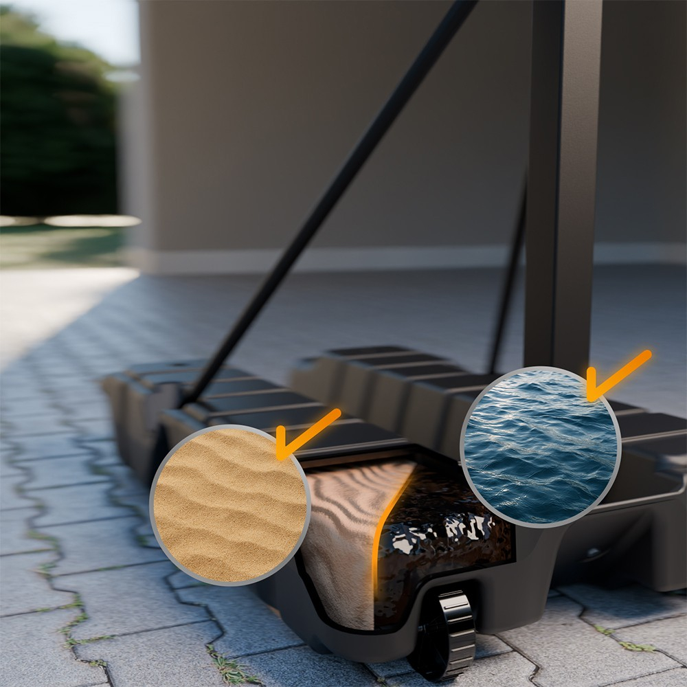 Plasa durabila din nailon rezista la ploaie, vant si chiar la aruncari puternice demne de un star NBA. Panoul din policarbonat este rezistent, dar usor, astfel incat poti juca intens fara griji. Inelul este fixat cu un arc de precizie care suporta lovituri puternice. Baza poate fi umpluta cu pana la 90 de litri de apa sau nisip, oferind stabilitate oriunde te-ai afla. De asemenea, este prevazut cu roti de transport care faciliteaza mutarea.