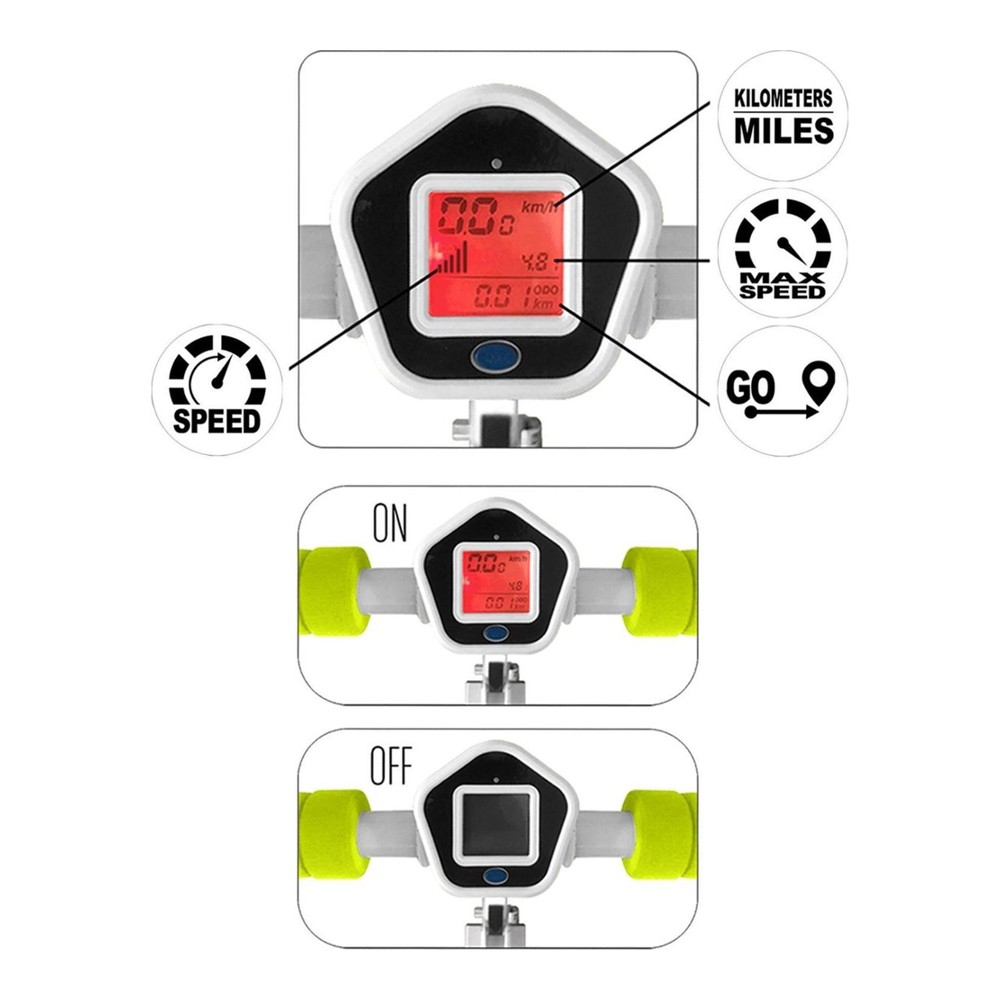 Vitezometrul afiseaza viteza actuala, astfel incat utilizatorul stie in orice moment cat de repede merge. In plus, vitezometrul inregistreaza si viteza maxima, permitandu-va astfel sa va urmariti performanta si sa comparati cursele individuale. De asemenea, afiseaza distanta totala parcursa, ceea ce va permite sa urmariti durata calatoriilor dvs. Toate aceste caracteristici vor face fiecare plimbare cat mai distractiva posibil.
