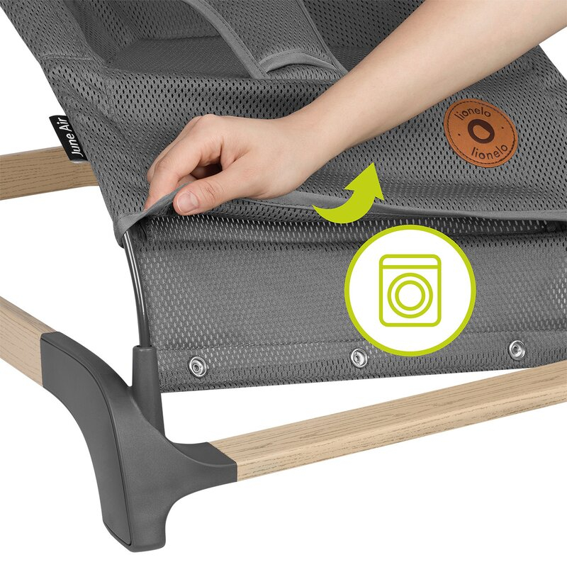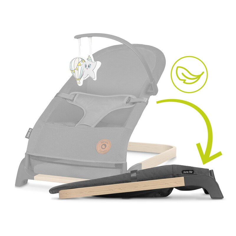 Pozitie ergonomica: Leganat in balansoar, copilul se poate odihni linistit . Datorita profilului adecvat al lui June, se va mentine pozitia corecta de sustinere a coloanei vertebralesi a capului copilului. Husa produsului a fost croita pentru a se conforma curbelor naturale ale corpului distribuind uniform greutatea corpului. In plus, este placuta la atingere, nu irita pielea si este lavabila. Odihna linistita este importanta, dar probabil te intrebi ce se intampla daca copilul tau are chef sa se joace? June are o arcada detasabila cu doua jucarii care il vor tine ocupat cu succes pe bebelus. Accesoriile colorate vor incuraja copilul sa se miste si sa-si intinda mainile pentru a-si satisface curiozitatea. Designul minimalist al lui June il face sa se potriveasca in orice interior.