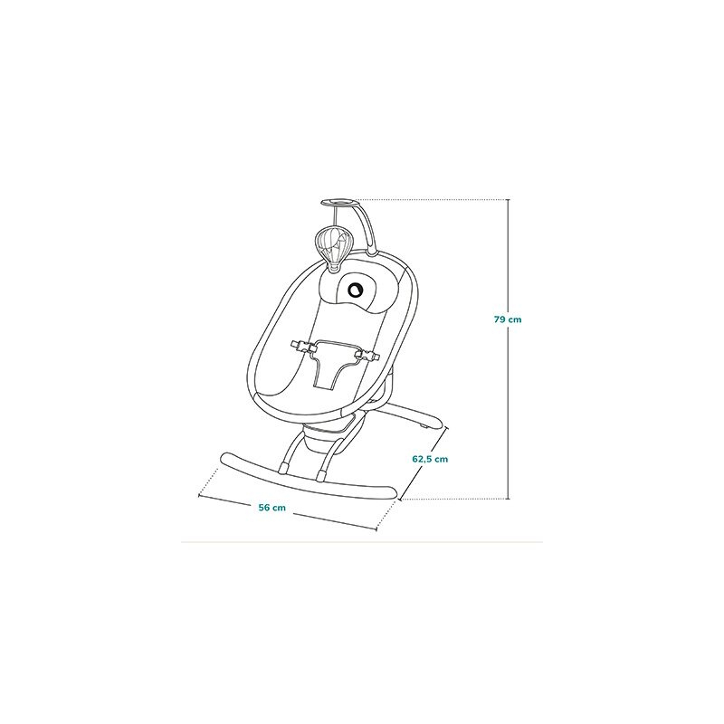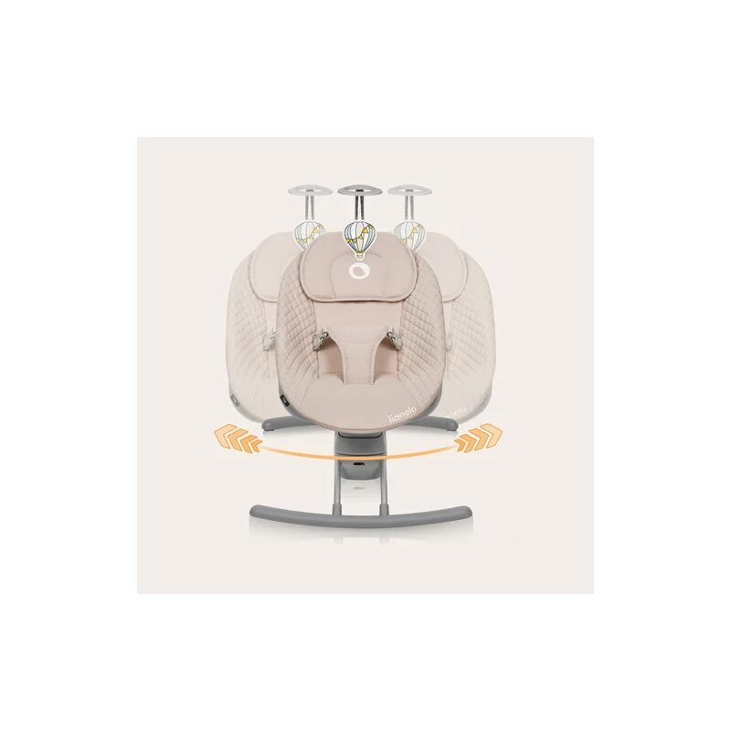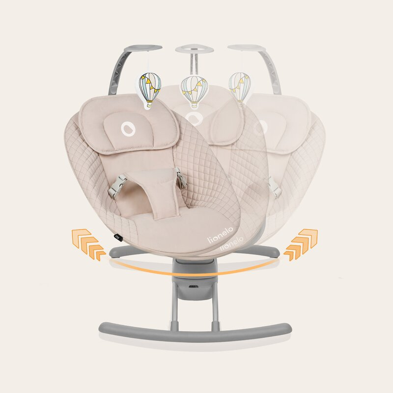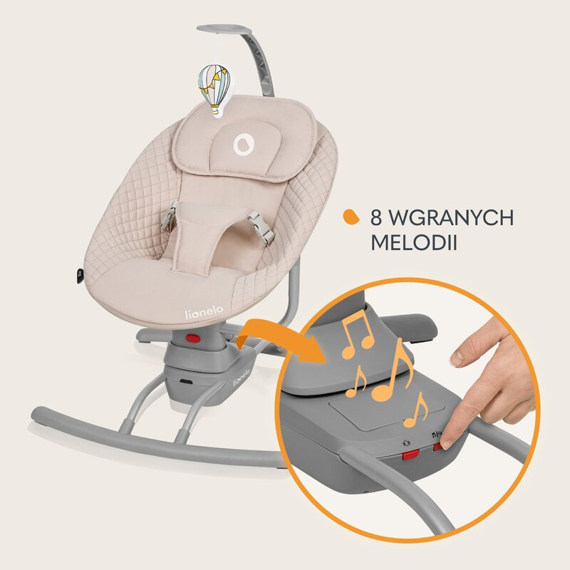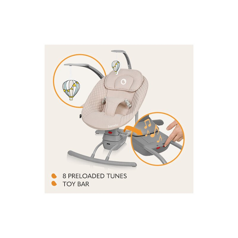 Leaganul este echipat cu 8 melodii inclusiv sunete din natura care ajuta la calmarea bebelusului. Bara de jucarii reglabila atrage atentia bebelusului, incurajandu-l sa-si intinda bratele. Bara de jucarii poate fi si ea demontata, daca este necesar.