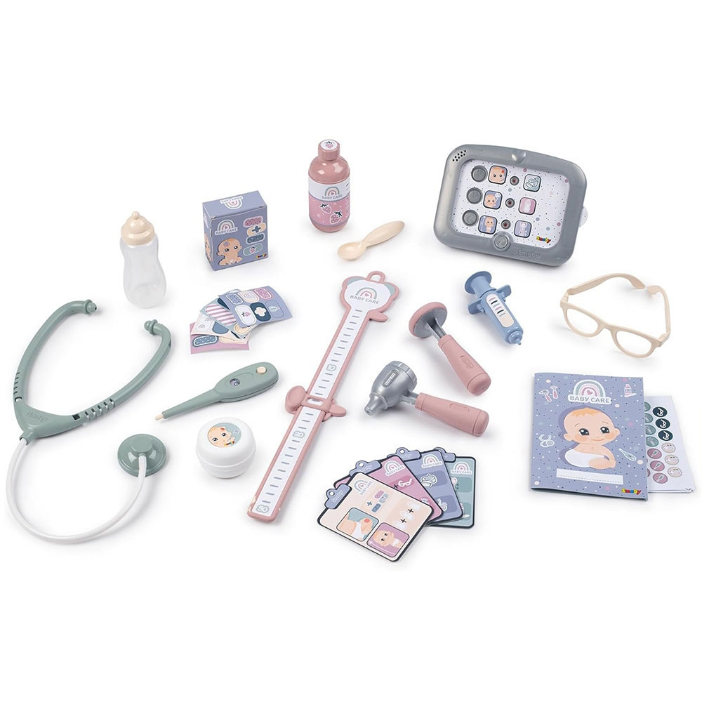 Include: eticheta autoadeziva pentru medic, ochelari de doctor, tableta (bateriile nu sunt incluse), ecran rotativ cu test de vedere si batai ale inimii, fisa medicala, cantar pentru bebelusi cu efect digital si ecran, tija de masurare detasabila, masa de examinare IML, stetoscop, termometru, otoscop, ciocan reflex pentru a verifica functiile motorii ale papusii, sirop, lingura, crema, seringa cu actiune mecanica, scutec de panza, biberon, cos de depozitare, cutie de prim ajutor