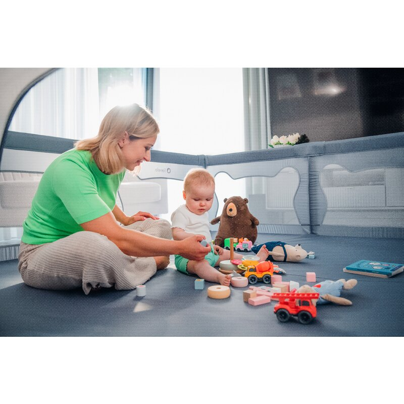 Datorita spatiului de joaca separat, parintele poate indeplini alte sarcini in timp ce copilul se afla intr-un loc sigur. Cele doua intrari laterale cu fermoar permit controlul deplin al spatiului - fermoarul este la exterior, astfel incat numai parintele poate decide sa le deschida. Produsul poate fi desfacut si pliat fara utilizarea uneltelor, iar dimensiunea compacta si geanta inclusa faciliteaza depozitarea. Materialul tarcului de joaca este usor de curatat, astfel incat produsul va dura multi ani.