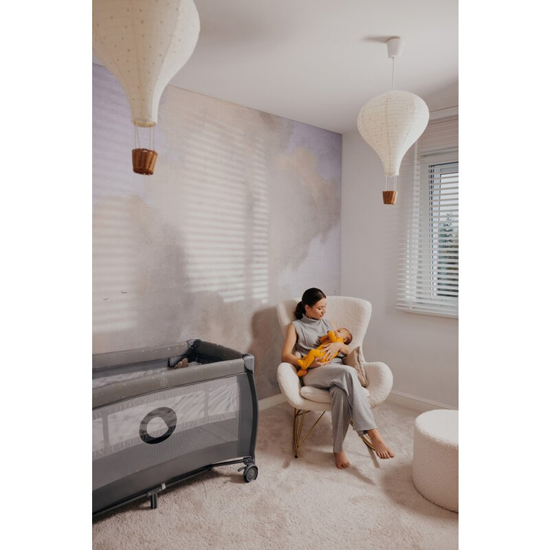 Constructia usoara, dar stabila, din otel, va va mentine copilul in siguranta, in timp ce partile laterale din plasa asigura un flux adecvat de aer. Doua roti il fac usor de mutat, permitand folosirea patutului in locuri diferite. Jucariile preferate si accesoriile esentiale pot fi depozitate in buzunarul lateral si sunt intotdeauna la indemana. Designul inaltat al patutului protejeaza copilul de contactul cu solul rece. O intrare laterala cu fermoar asigura accesul copilului in momentul in care produsul este folosit pe post de tarc de joaca. Daca se murdareste, il puteti curata cu usurinta.