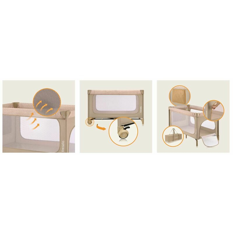 Panoul lateral cu fermoar permite copiilor mai mari sa intre singuri in patut. Buzunarul practic ofera spatiu pentru depozitarea scutecelor, jucariilor sau servetelelor. Geanta de transport inclusa adauga un plus de comoditate pentru calatorii. Fabricat din material dens tesut, pentru durabilitate maxima.