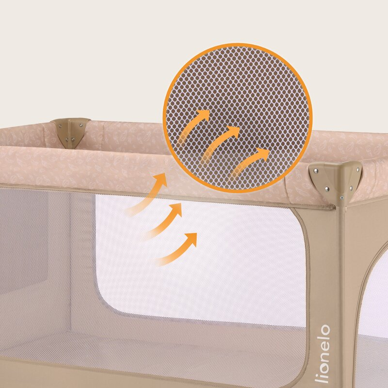 Laturile din plasa asigura o aerisire excelenta si ofera vizibilitate buna atat pentru copil, cat si pentru parinte. Acest lucru permite mentinerea unui contact vizual constant intre copil si parinti.