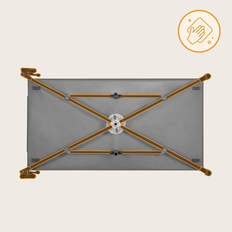 Sistemul inovator Easy Fold permite plierea patutului in cateva secunde. Trebuie doar sa scoateti salteaua, sa rasuciti si sa trageti de manerul din mijloc pentru ca produsul sa se plieze automat. Pentru a pregati rapid spatiul de odihna, indreptati laturile opuse si apasati manerul rosu din centrul patutului. Intregul proces dureaza doar cateva secunde si nu necesita unelte sau ajutor suplimentar.