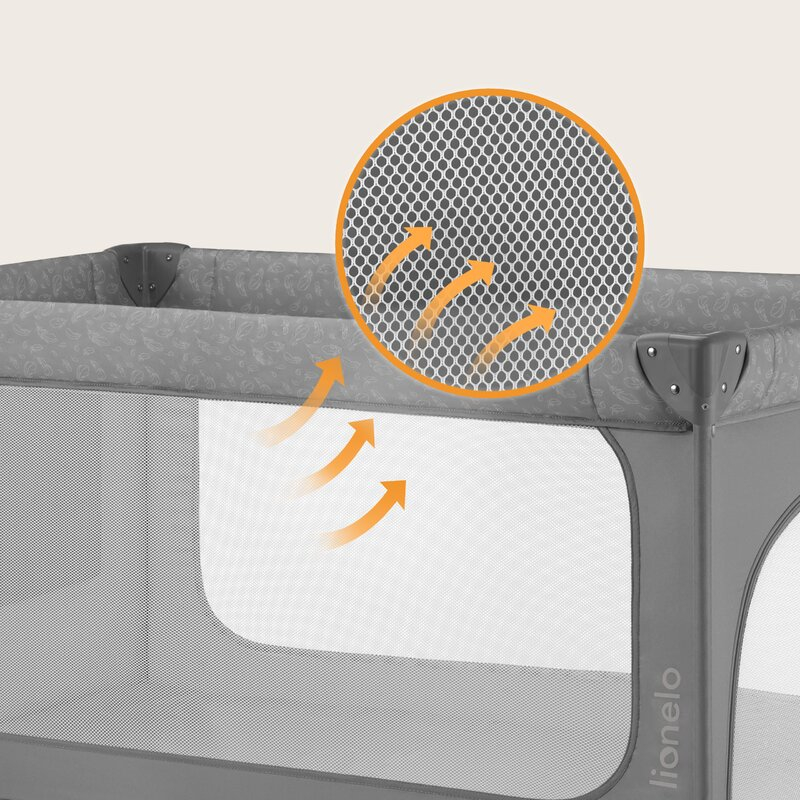 Laturile din plasa asigura o aerisire excelenta si ofera vizibilitate buna atat pentru copil, cat si pentru parinte. Acest lucru permite mentinerea unui contact vizual constant intre copil si parinti.