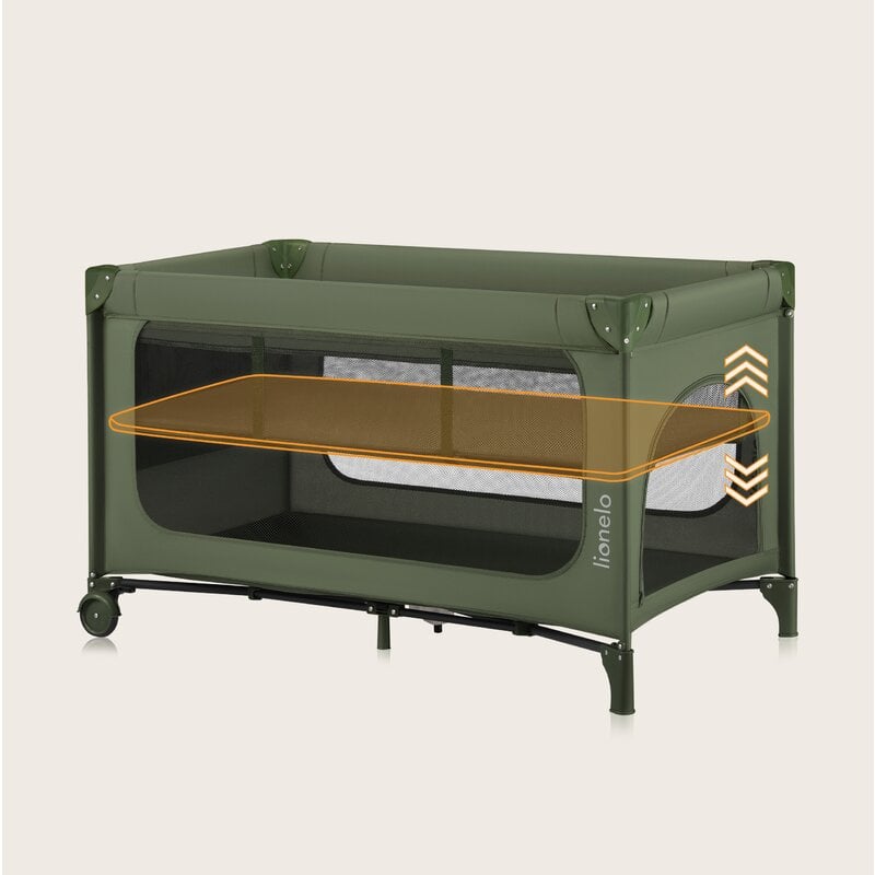 Cu doua niveluri de suspensie, salteaua poate fi ajustata in functie de varsta si nevoile copilului. Nivelul superior este destinat celor mai mici copii (pana la 9 kg) sau pana cand acestia incep sa stea in sezut, reducand astfel efortul parintilor de a se apleca.