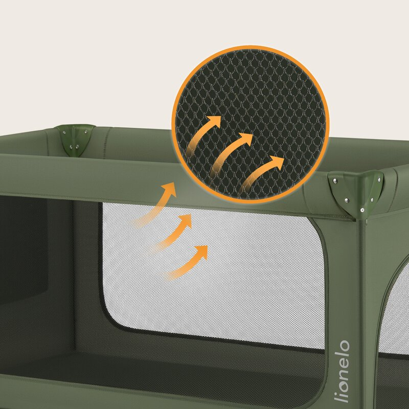 Laturile din plasa asigura o aerisire excelenta si ofera vizibilitate buna atat pentru copil, cat si pentru parinte. Acest lucru permite mentinerea unui contact vizual constant intre copil si parinti.