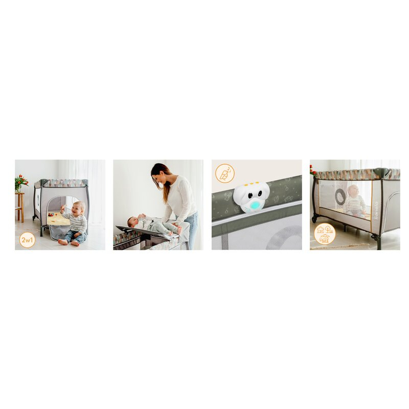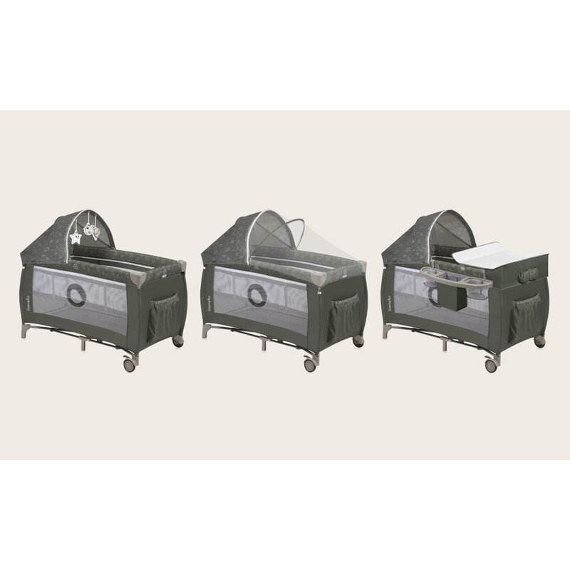 Copertina functionala (cu 3 jucarii captivante) va protejeaza bebelusul de lumina soarelui si de stimuli inutili, iar plasa de tantari inclusa va protejeaza impotriva insectelor. Asadar, patutul de copii poate fi folosit si in aer liber atunci cand temperatura o permite.