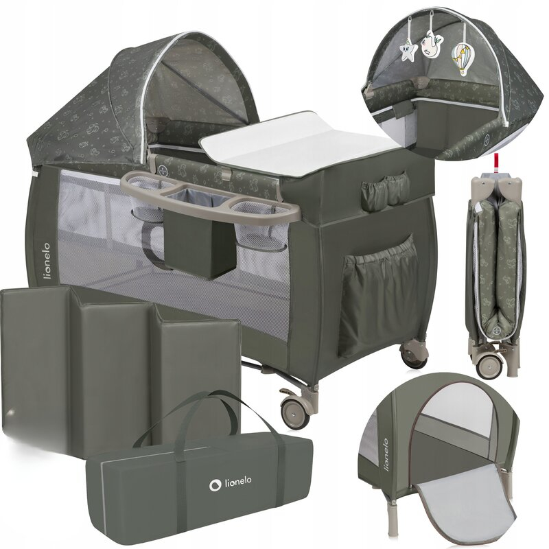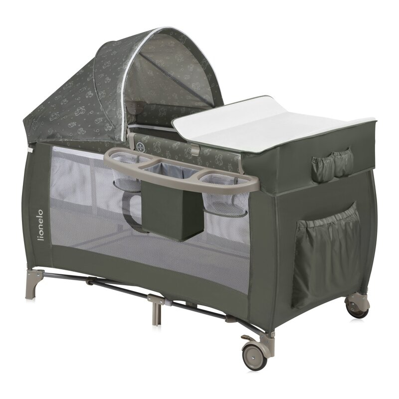 Lionelo Patut pliant, Lionelo, Sven Plus, 120x60 cm, cu doua nivele, cu arcada jucarii, masuta de infasat, vibratii, melodii, Bej Olive