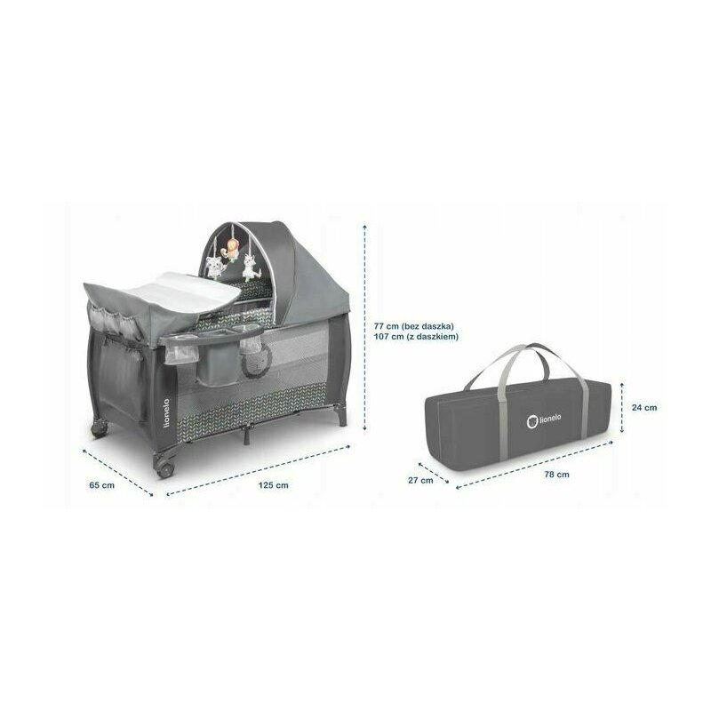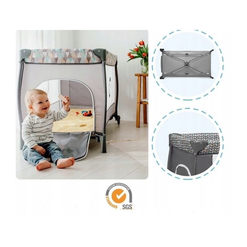 Patutul de calatorie Lionelo Sven Plus are un cadru durabil, stabil, pliabil, care este echipat cu sistemul LockGuard. Este conceput pentru a proteja impotriva plierii accidentale a structurii. Marginile rotunjite permit utilizarea fara griji. Peretii produsului sunt realizati din plasa respirabila, care asigura o buna ventilatie si permite observarea continua a copilului mic, fara a fi nevoie sa se desprinda de indatoriri. Patutul nostru a fost testat de SGS, care a confirmat conformitatea cu standardele EN 716 si EN 12221.
