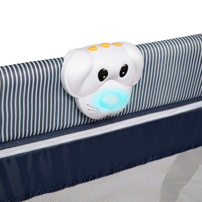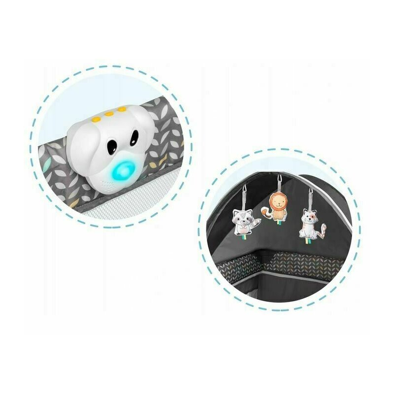Copertina functionala (cu 3 jucarii captivante) va protejeaza bebelusul de lumina soarelui si de stimuli inutili, iar plasa de tantari inclusa va protejeaza impotriva insectelor. Asadar, patutul de copii poate fi folosit si in aer liber atunci cand temperatura o permite.