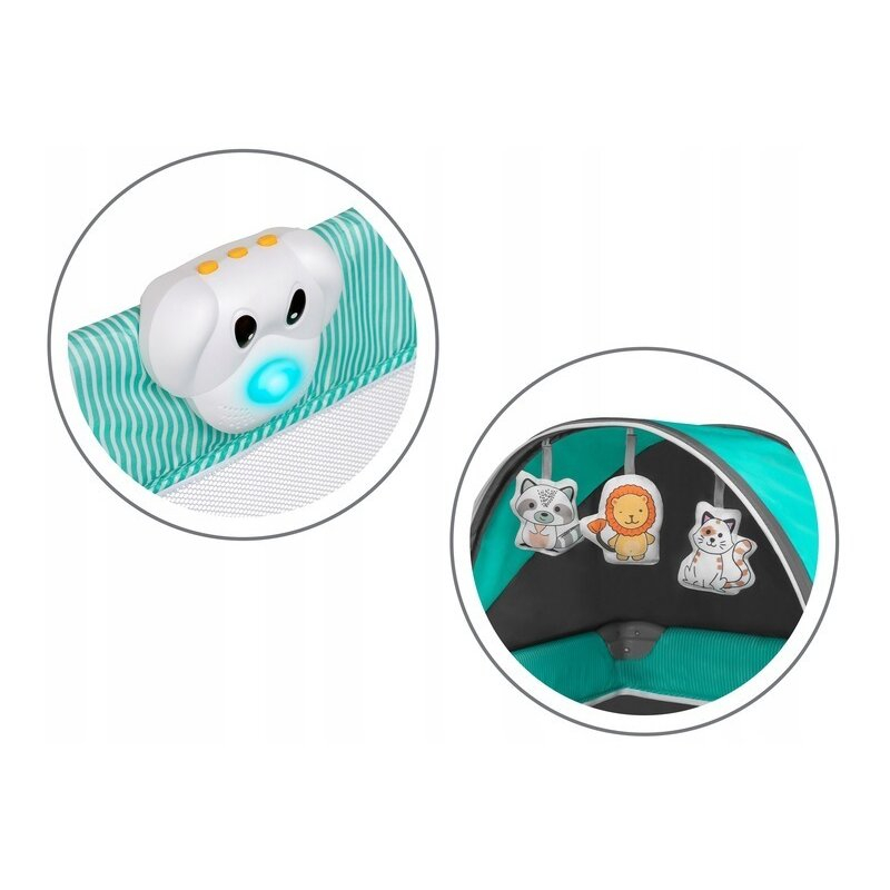 Copertina functionala (cu 3 jucarii captivante) va protejeaza bebelusul de lumina soarelui si de stimuli inutili, iar plasa de tantari inclusa va protejeaza impotriva insectelor. Asadar, patutul de copii poate fi folosit si in aer liber atunci cand temperatura o permite.