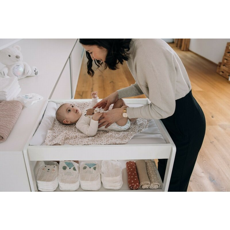 Doua rafturi spatioase ofera acces rapid la toate lucrurile esentiale: scutece, servetele, hainute sau produse de ingrijire;