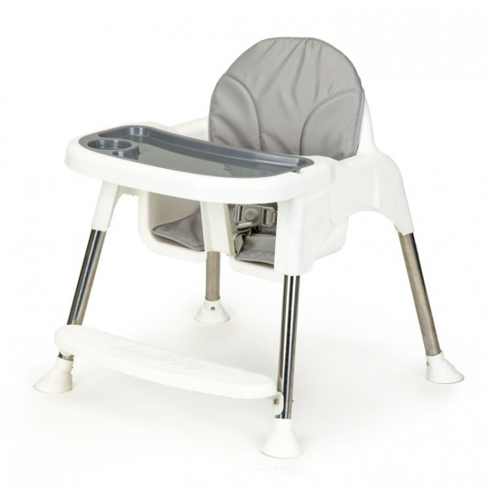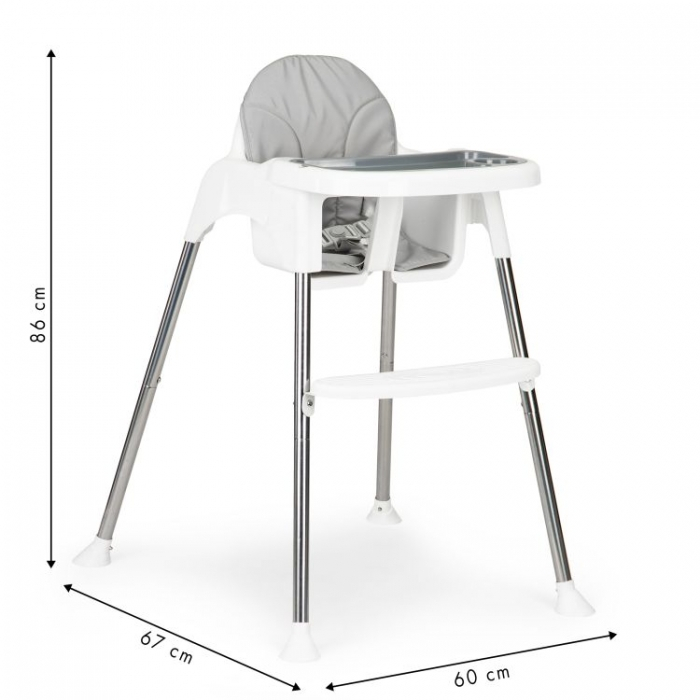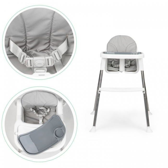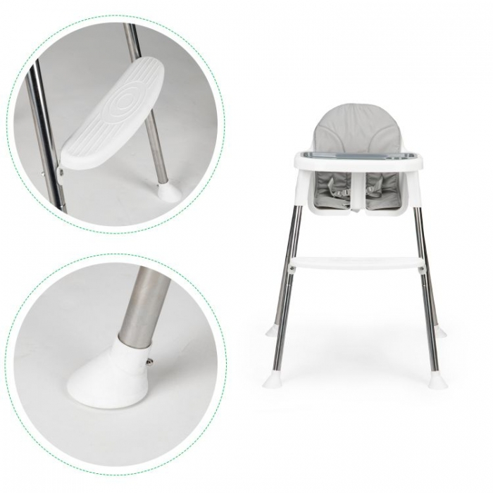 Scaunul de masa are picioare antiderapante din cauciuc, care protejeaza suplimentar podeaua impotriva zgarieturilor. Blocarea pentru copii impotriva alunecarii si centurile de siguranta in 5 puncte ofera cea mai inalta protectie pentru un copilas. Scaunul are un suport pentru picioare si o tava detasabila conturata. Husa scaunului de masa poate fi indepartata cu usurinta pentru a putea fi curatata.