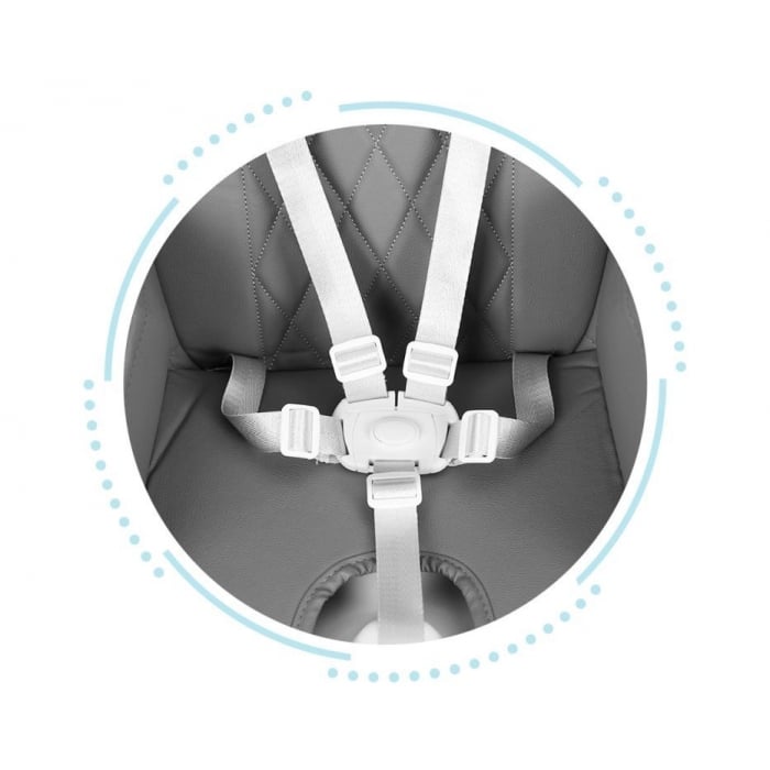 3 in 1: scaun de masa inalt, scund sau scaun atasat de alt scaun. Este cunoscut printr-o structura stabila, design modern si picioare metalice rezistente. Este echipat cu o tava detasabila, reglabila, cu 2 straturi, un blocaj de siguranta pentru copii si centuri de siguranta in 5 puncte.