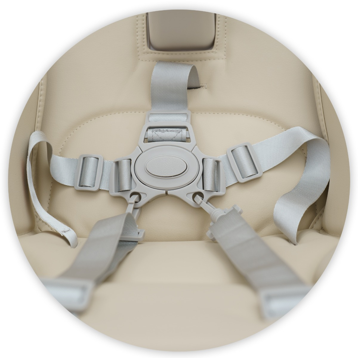 —‹ Centura de siguranta cu prindere in 5 puncte este reglabila pe inaltime pe 2 niveluri si il protejeaza pe micut de caderile accidentale.