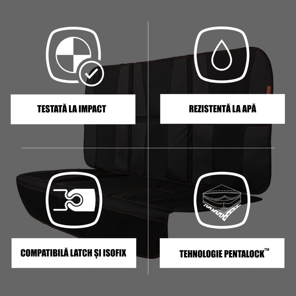 - Acopera intreaga bancheta din spate, pentru o protectie completa a tapiteriei impotriva murdariei si zgarieturilor.