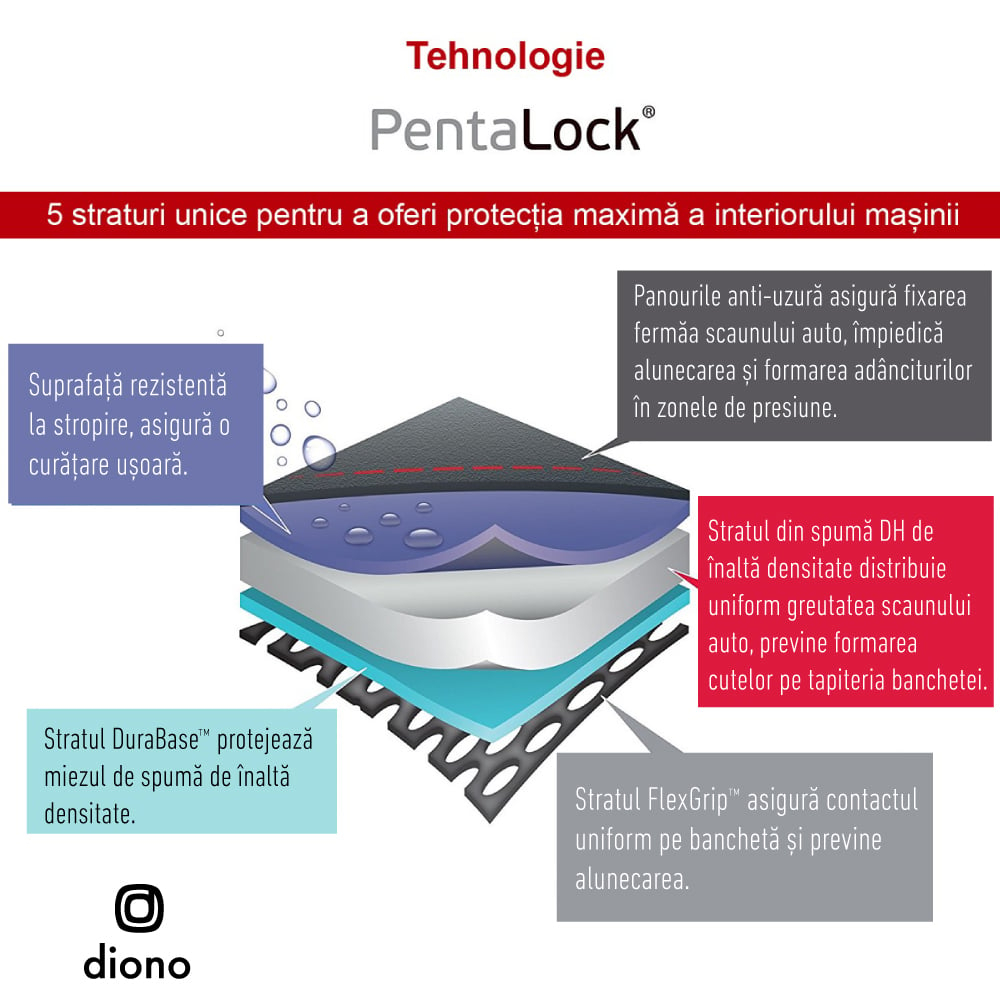 - Toate dispozitivele de protectie pentru banchete Diono au fost testate la impact pentru un plus de siguranta si sunt fabricate din materiale rezistente la uzura, pentru protectia zilnica si de lunga durata.