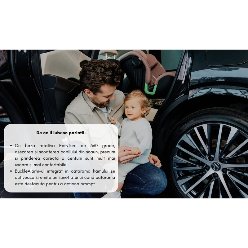 Baza rotativa faciliteaza considerabil asezarea si scoaterea copilului din scaun, sporind confortul general al utilizatorului. Datorita capacitatii de rotatie, este posibila si schimbarea directiei scaunului fara a fi nevoie sa il scoateti.