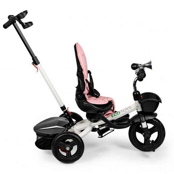 Tricicleta cu sezut reversibil Ecotoys JM-311 cu scaun rotativ, contructie sigura si durabila din otel, un sistem de pliere facil, un cadru din otel, parasolar pliabil, picioare pliabile, roti rezistente din cauciuc, tija de directie ajustabila pe inaltime, frana si aparatoare de noroi, balustrade de protectie, vizorul pliabil care va proteja impotriva ploii si soarelui
