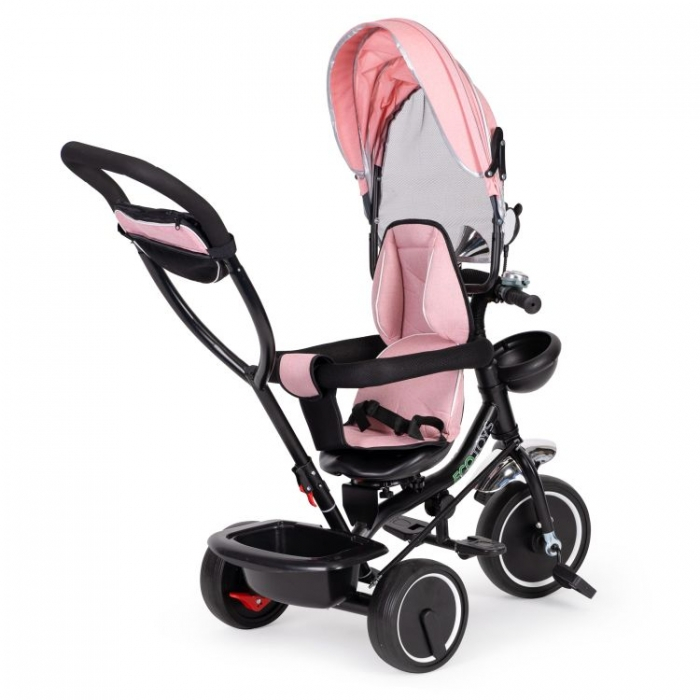 Tricicleta Ecotoys asigură confortul atât pentru copil, cât și pentru părinte, datorită dotării cu capotină retractabilă și mâner de ghidare a direcției. Tricicleta cu cadru metalic și roți din spuma EVA (nu sunt gonflabile) rezistente, cu caracteristici de cărucior datorită parasolarului de protecție împotriva soarelui, vântului și chiar a ploii.