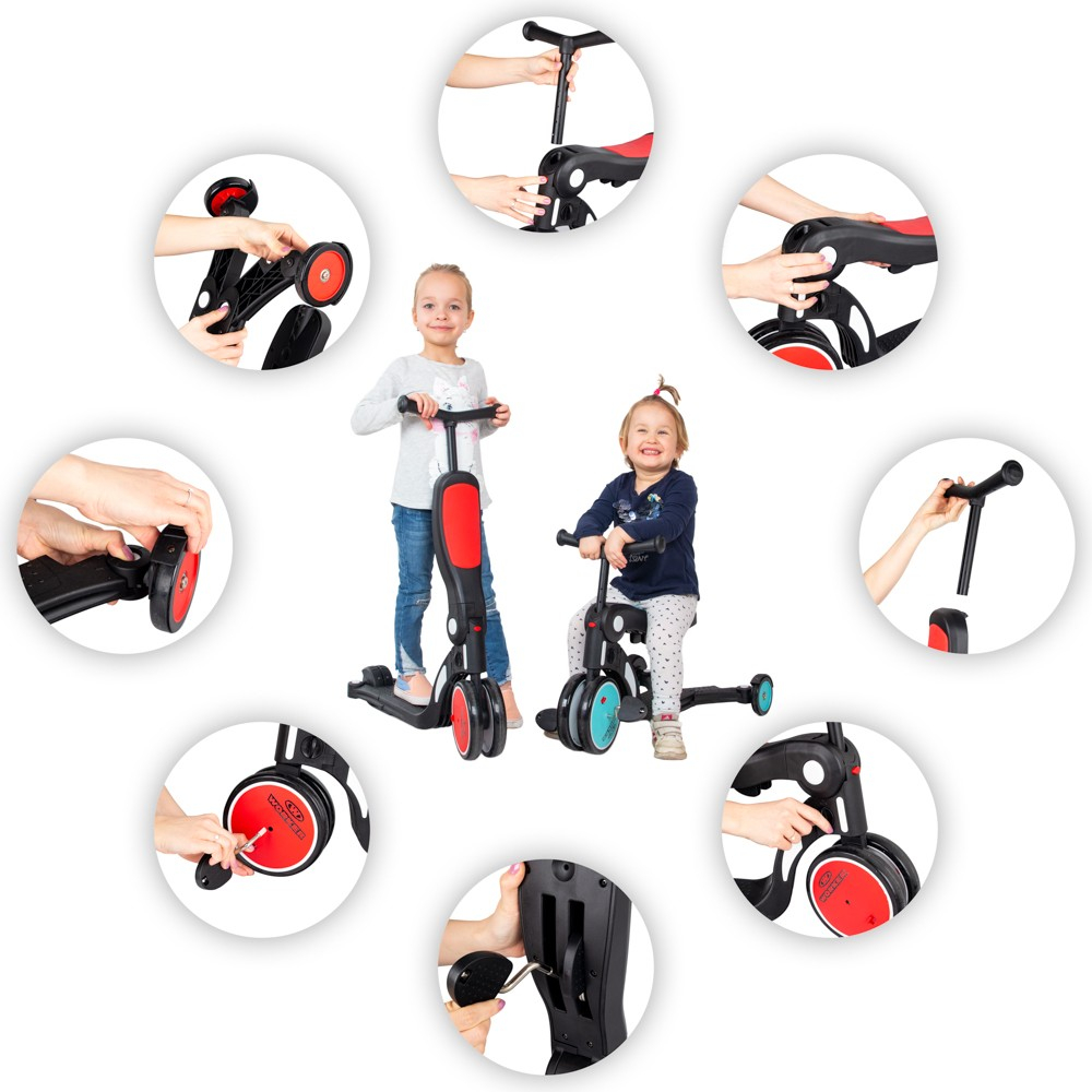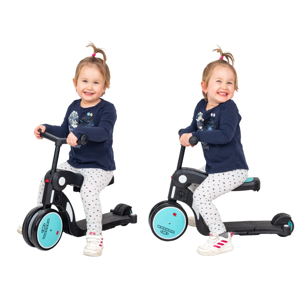 Tricicleta multifunctional pentru copii 5-in-1 WORKER Finfo este potrivit pentru micii calareti, alaturi de care va creste. Un go-kart, o bicicleta de echilibru si un scuter intr-unul, acest copil are o gama larga de utilizari. Rotile din spate pot fi reglate in trei pozitii diferite, permitand copilului sa-si dezvolte echilibrul si coordonarea. Trecerea de la un vehicul la altul, precum si reglarea pozitiilor rotilor este rapida si usoara.