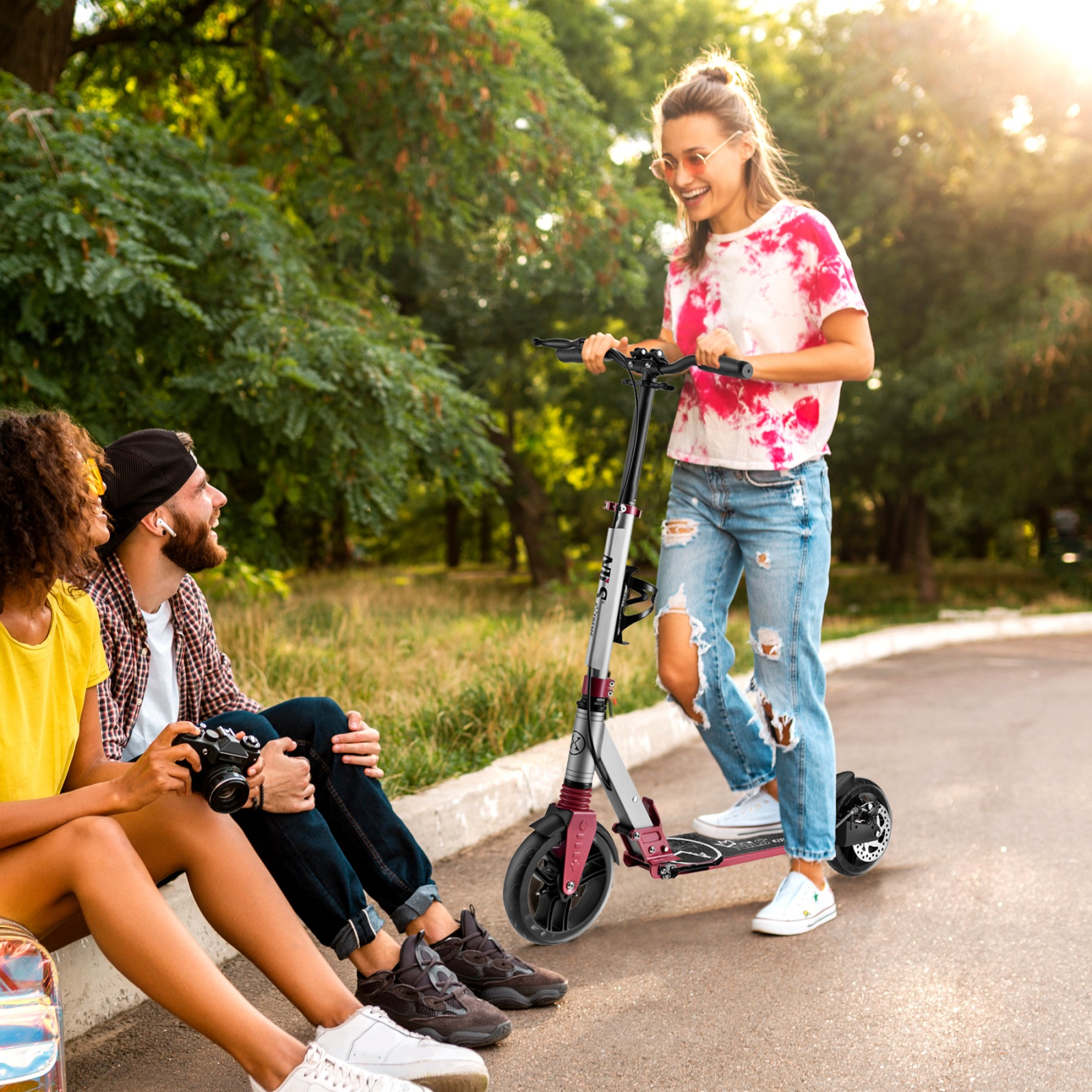 Siguranta si confortHM122T este echipata cu manere ergonomice, confectionate din material antiderapant TPR, care asigura o priza ferma si confort in timpul utilizarii. Inaltimea ghidonului este reglabila (intre 93 cm si 110 cm), permitand adaptarea trotinetei la inaltimea utilizatorului pentru un control mai bun. Un alt avantaj este frana pe disc montata in spate, care ofera o oprire eficienta si sigura in orice situatie.